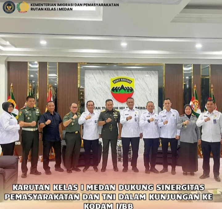 MGLOBALONLINE.COM | Medan – Kepala Rumah Tahanan Negara (Rutan) Kelas I Medan, Andi Surya, turut mendampingi Kepala Kantor Wilayah Direktorat Jenderal Pemasyarakatan (Kanwil Ditjenpas) Sumatera Utara, Yudi Suseno, dalam kegiatan kunjungan ke Markas Kodam I/Bukit Barisan yang diterima langsung oleh Pangdam I/BB Mayjen TNI Rio Firdianto.