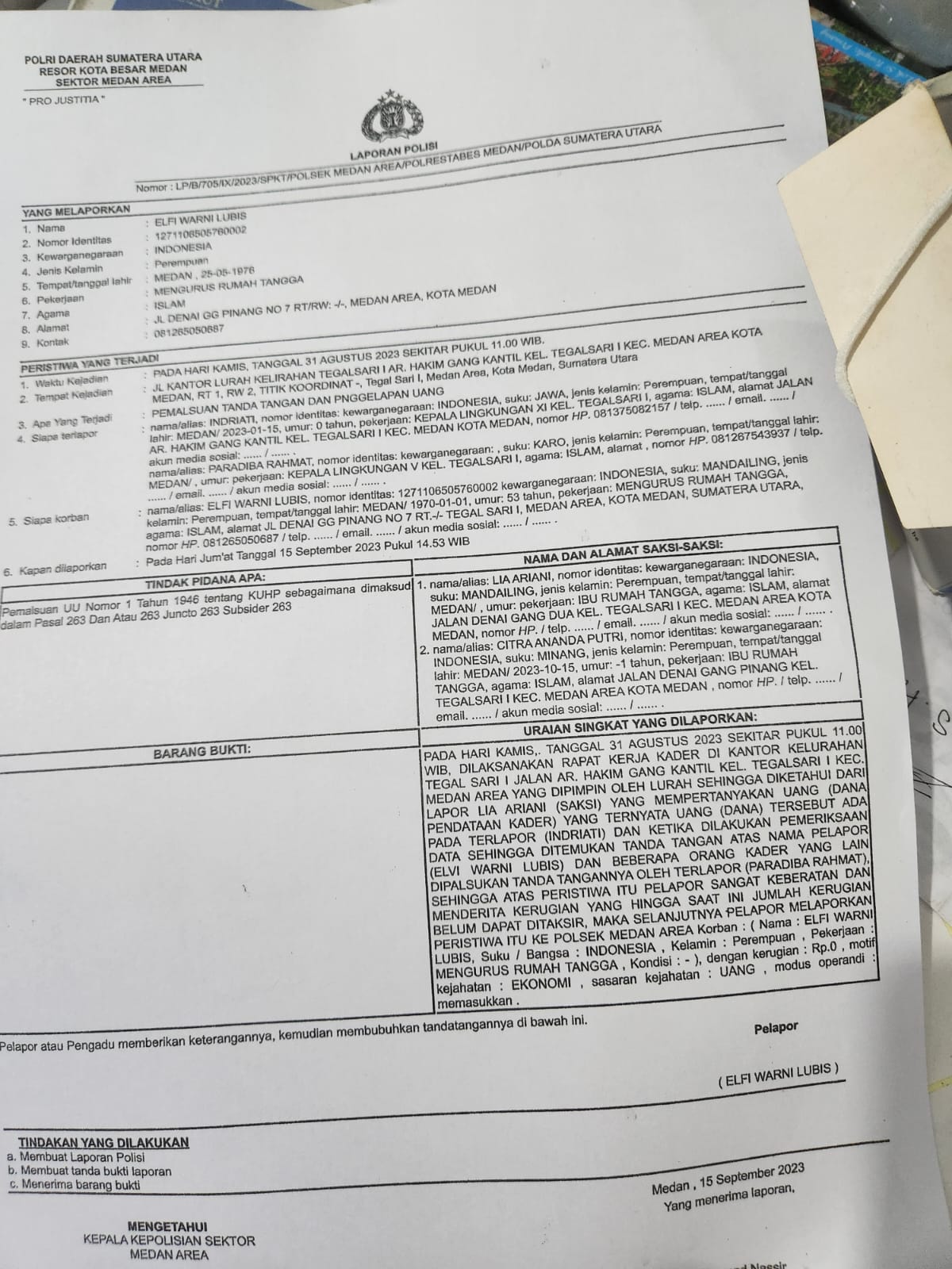 Keduanya dilaporkan oleh seorang wanita, Elfi Warni Lubis, warga Jalan Denai Gang Pinang, Medan Area yang merupakan salah satu kader dan korban penggelapan dan pemalsuan tanda tangan ke Polsek Medan Area Polrestabes Medan Polda Sumatera Utara pada 15 September 2023 dengan Laporan Polisi Nomor: LP/B/705/IX/2023/SPKT/POLSEK MEDAN AREA/POLDA SUMATERA UTARA.